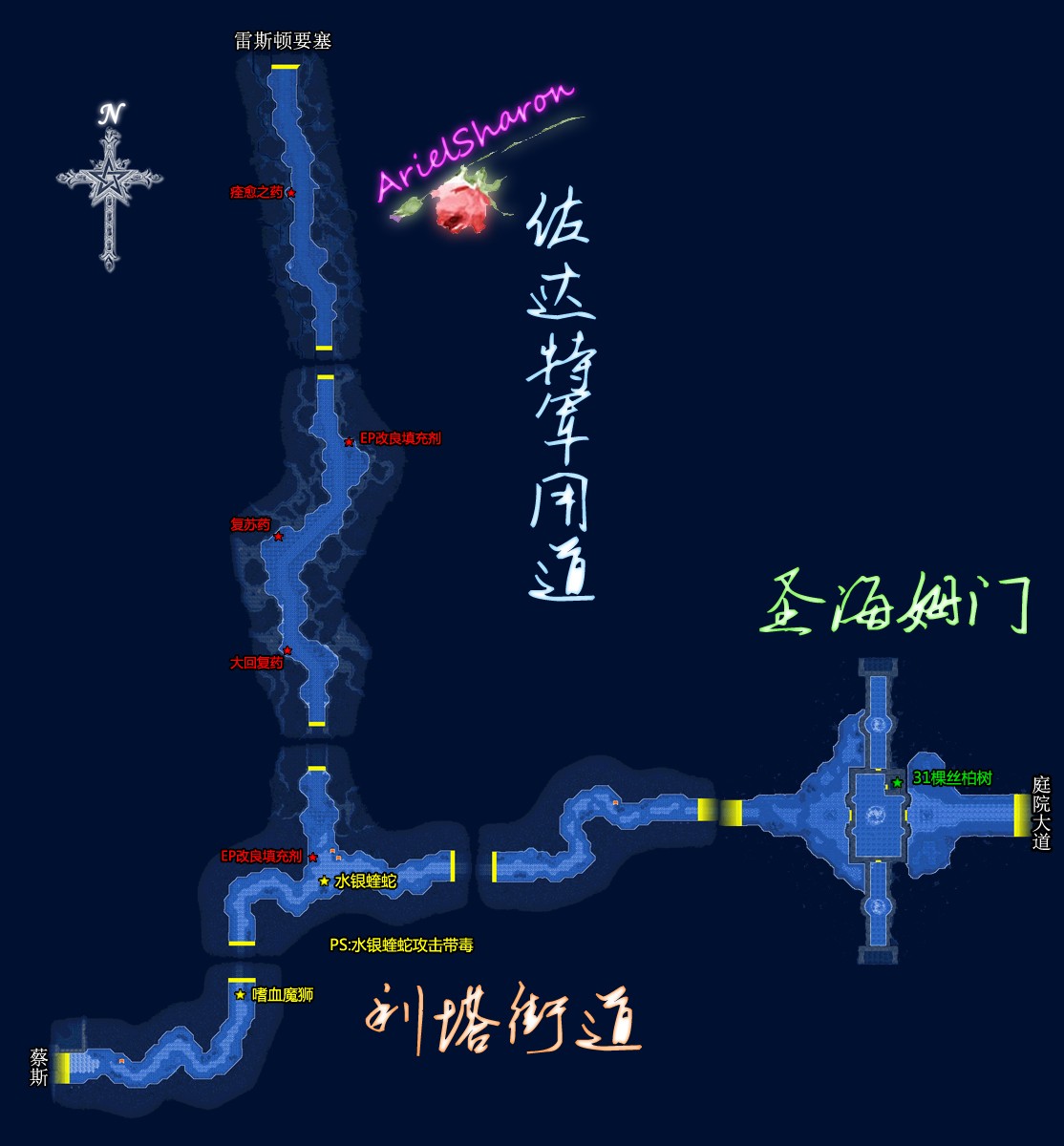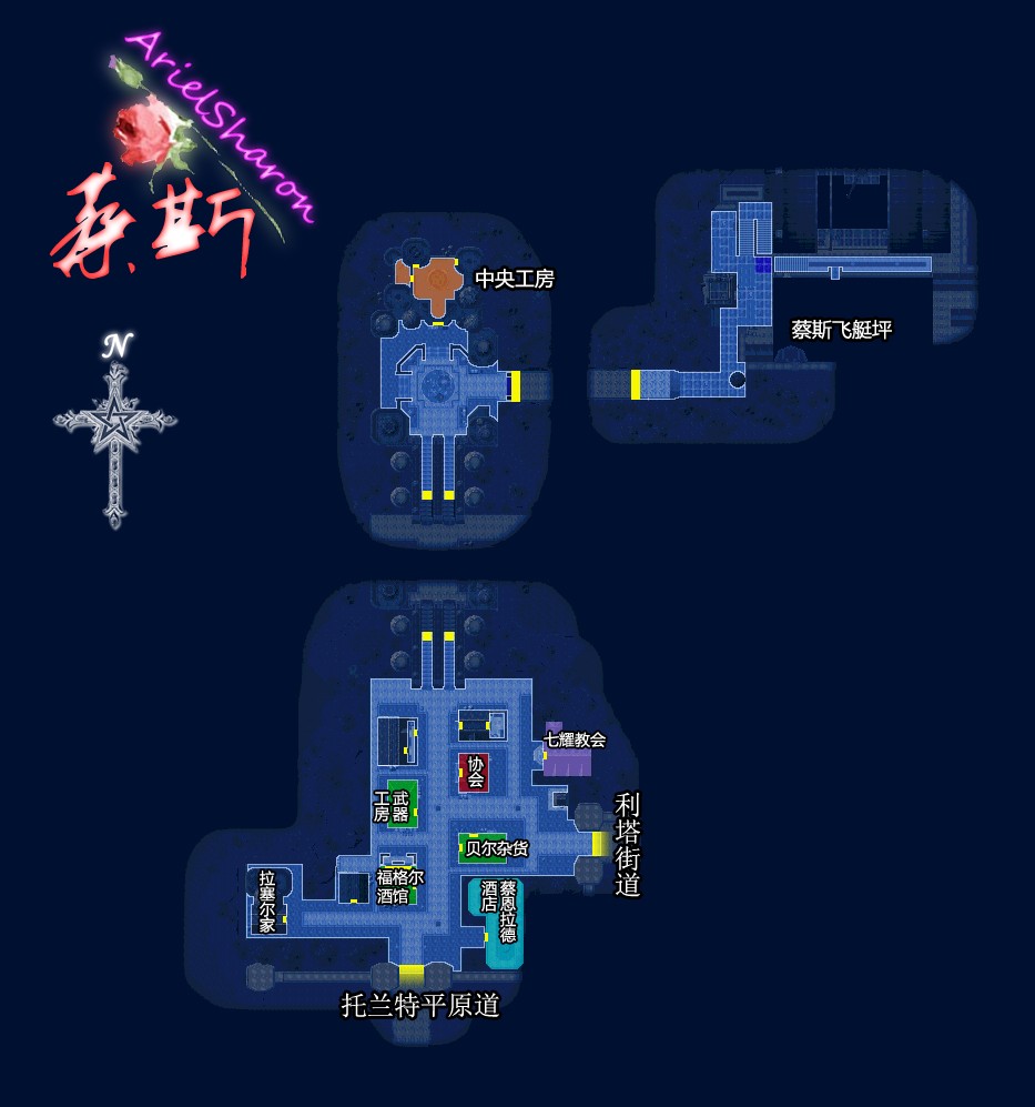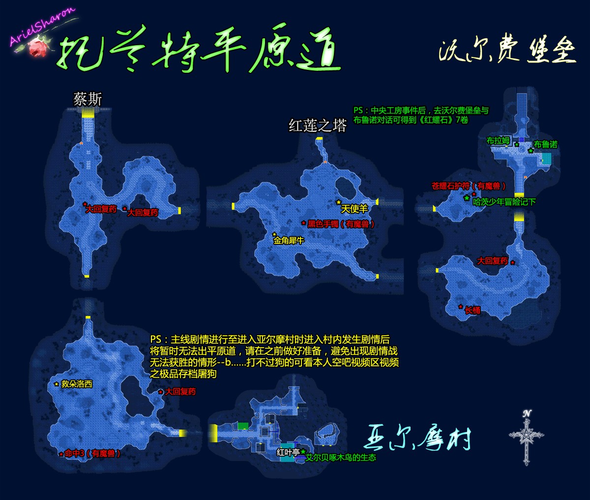 【注:地图有误,装有长筒的宝箱是个魔兽宝箱;亚尔摩村外的场景内,救朵洛希地点东侧有一个普通宝箱,具体位置请参考SC第二章对应地图】