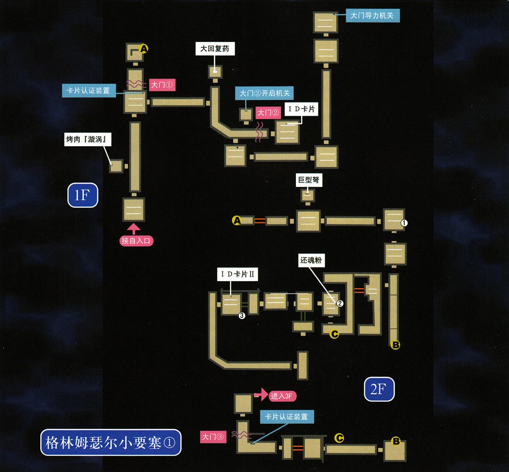 要塞1F基本布置跟SC区别不大,注意拿到ID卡片之后才能启动终端。2F有红色和绿色的机关桥,所有同色机关桥是连锁的,桥旁边的机关可以调整颜色,机关为红色时红桥架起绿桥消失,反之亦然。建议先拿到装备"巨型弩",之后来到图中①的位置,切换装置后拿完还魂粉之后到③的位置,取得"ID卡片II",回到②位置,切换装置颜色,通往3F的桥就架起了,使用ID卡片II就能继续前进了。