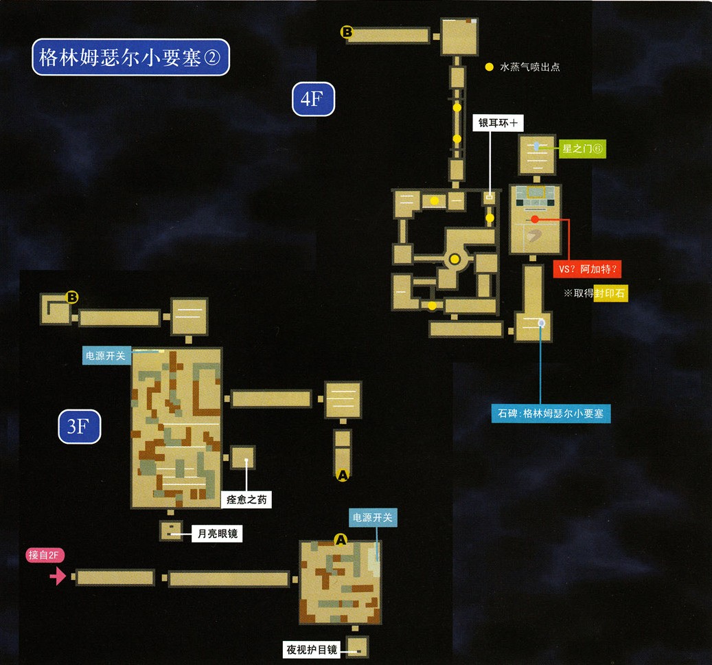 3F有两个房间一团漆黑,首先要找到"夜视护目镜",装好之后尽快找到电源开关恢复照明。4F要注意路上的蒸汽装置,接触会使队员受到HP损失。前方有石碑,准备好之后继续前进迎接BOSS战。BOSS战对手?阿加特?,敌人物理攻击力极强,一定要注意回复。战斗后不要着急离开,前面有一个星之门。