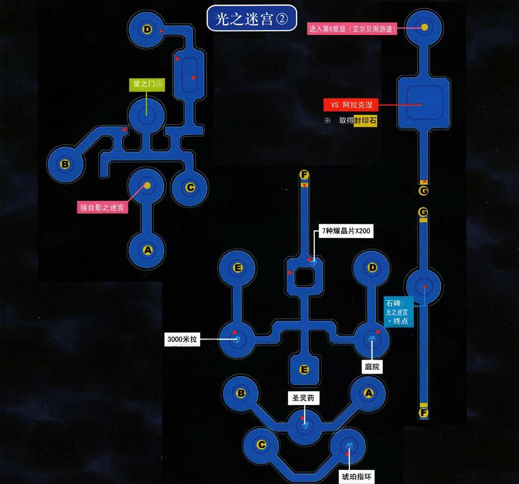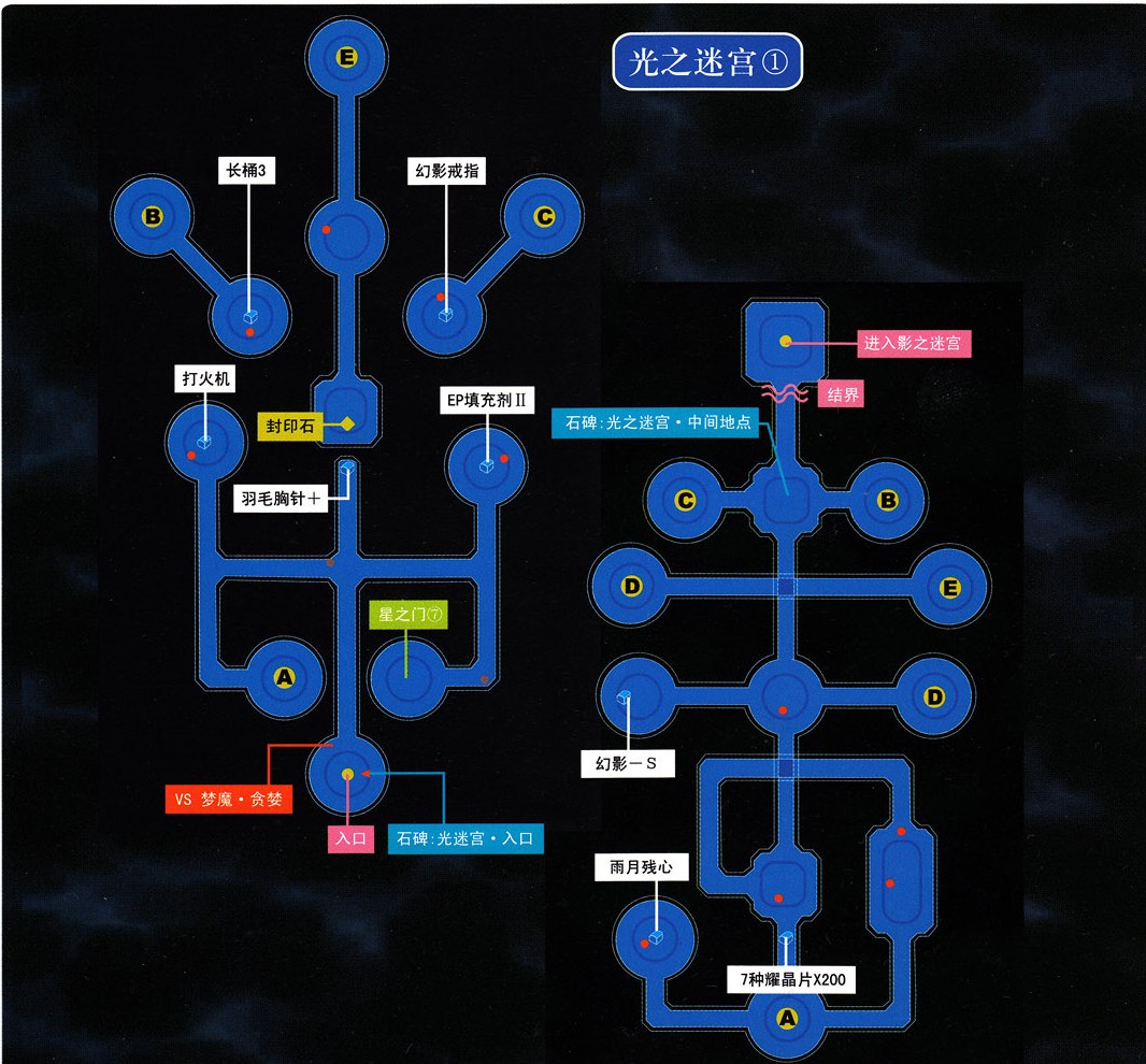 第五话敌人会大量使用带异常状态的攻击,建议带上防石化等威胁比较大的饰品出战。经过第四话BOSS战位置的传送阵进入第五话的主迷宫——光与影的迷宫。进入后马上开始强制战斗,建议多用全屏攻击快速解决战斗。光之迷宫①探索完毕之后不要忘了带着刚拿到的封印石回到据点解封,解封出来的是理查德,此人曾是FC的总BOSS,这次作为队员加入我方,战斗力极为惊人,拥有一流的速度、攻击力、魔法力,尤其是他的战技光鬼斩和光轮斩拥有极短的硬直时间,在战斗中可以连续使用,对BOSS造成巨大伤害。此时迷宫中的星之门⑦能进入了。