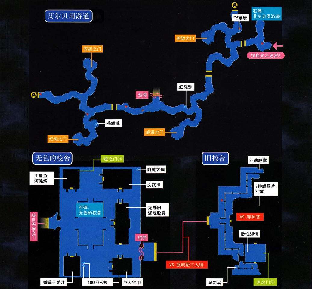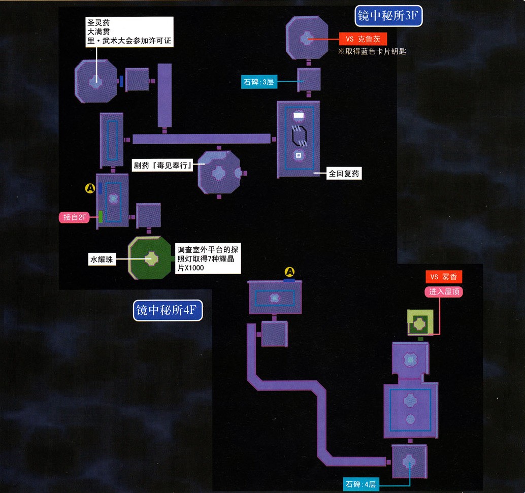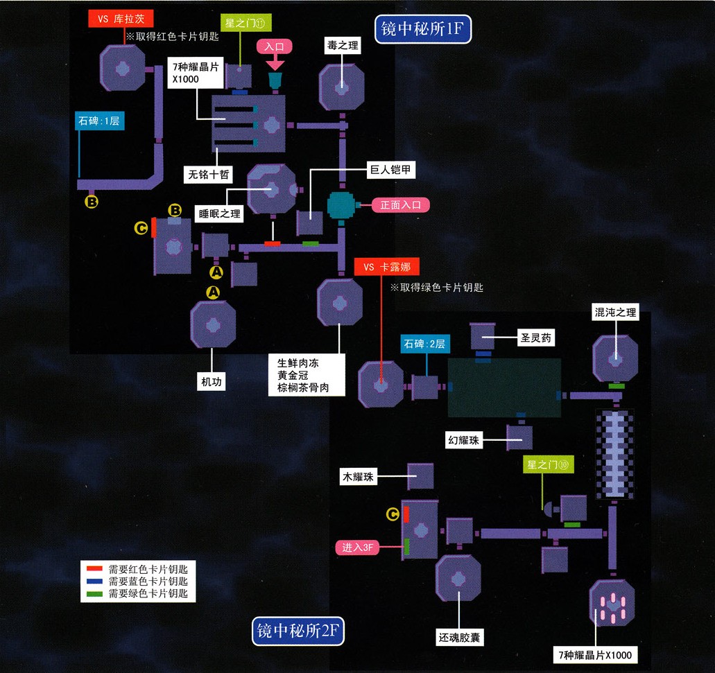 (图中一层的7种耀晶片各1000需要调查图示位置的传送带获得)回到据点,把亚妮拉丝带上,经过琥耀之门进入下一个地点——湖畔研究所。这次的地图与SC的研究所正好是镜像分布的。进入建筑之后马上进入强制战斗,敌人反射魔法攻击。这次的建筑同样有三个卡片,用特定的卡片会打开特定的门。继续前进到1F深处进行第一场BOSS战,注意防止气绝即可。2F终点的对手是卡露娜,同样要防止气绝。3F对手是克鲁茨,注意回复即可。三战后获得三个卡片,这时出发把所有的验证门都打开吧。下面的对手很强大,建议所有参战队员等级都升到120级。这名BOSS是雾香,如果有肉搏系队员尽量冲上去跟她贴身近战,同时注意回复。雾香的S技伤害相当惊人,被攻击后必须立刻回复。