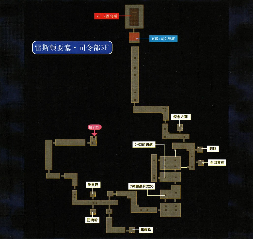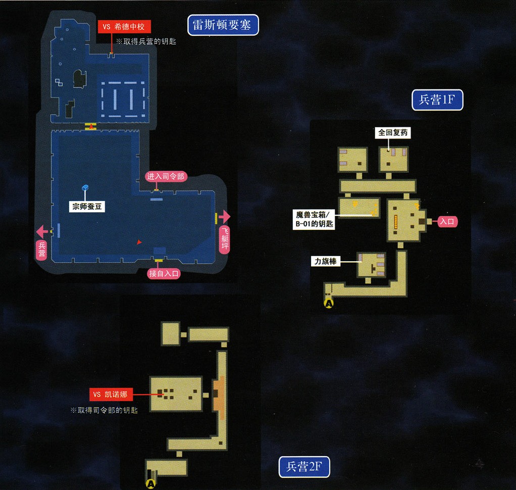 战斗后拿到兵营钥匙,进入兵营。兵营内有全游戏唯一一个魔兽宝箱,拿到B-01钥匙。接着前往南边跟凯诺娜作战,此战特务兵的威胁很大,建议优先清除。战斗后获得司令部钥匙,进入司令部。司令部1F有星门12,正好理查德在队,直接进去即可。