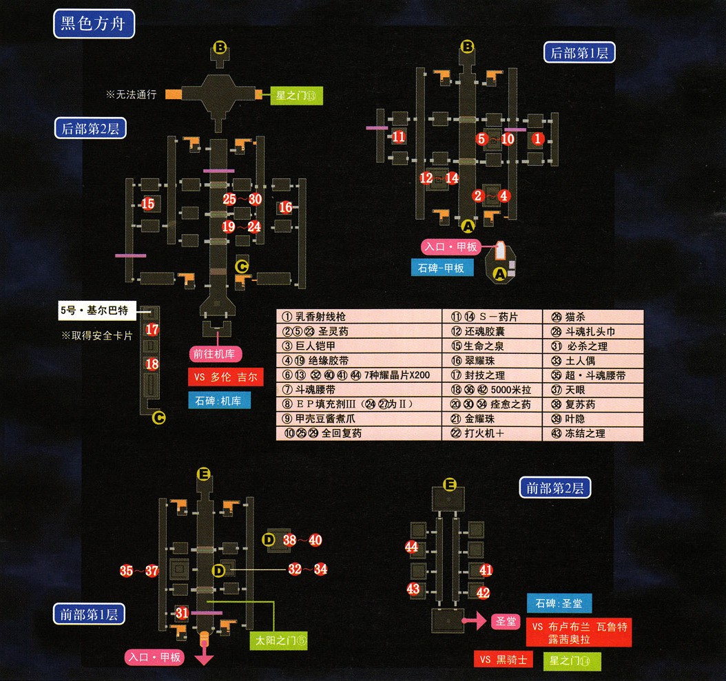 回到据点把约修亚加入队伍,前往艾尔贝周游道开启最后一个门——黑曜之门,就来到了古罗力亚斯。按照图中A-B-C-D-E的顺序走,注意收集沿途的宝箱和调查星门13、太阳之门⑤,到了C点先去救基尔巴特拿到最新的安全卡片之后再前往机库。机库内发生BOSS战,敌方会用黑暗状态的攻击,注意防御。战斗胜利后乔斯特的S技"山猫号"会得到强化(无论她是否在队都能强化。之前如果没通过太阳之门①学会山猫号的话这里会直接学会山猫号II)。继续前进将会同时面对三位执行者,做好准备吧。首要防止的异常状态是气绝。