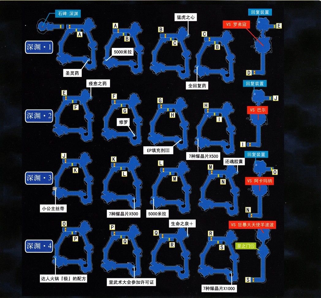 深渊的结构很简单,一条线走到底即可,注意第四个BOSS大天使羊的出现条件:打死前三个BOSS之后,并且没有经过深渊入口的石碑进行传送的话,大天使羊就会出现在深渊的终点。由于不能使用入口处的石碑传送,所以第一批队员只能一直前进到终点前的星之门15才能回到据点。好在前三个BOSS难度不大,大多数人员配比都能轻易通过。
