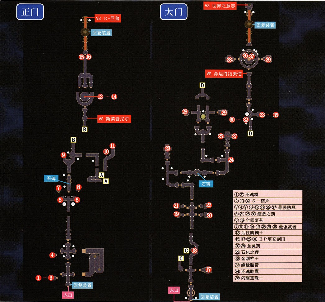 每个门都有大量最终装备,不要忘了拿。中间会遇到中BOSS,注意防御即死、混乱等状态;如果陷入困境的话,此战允许逃跑,退出来重新调整再继续也可以。继续前进到回复装置,把给别的队伍的回路卸下,调整好本队的装备回路,存档之后继续前进,镜头会切回幻影城入口,继续选择队伍。下面介绍右门。