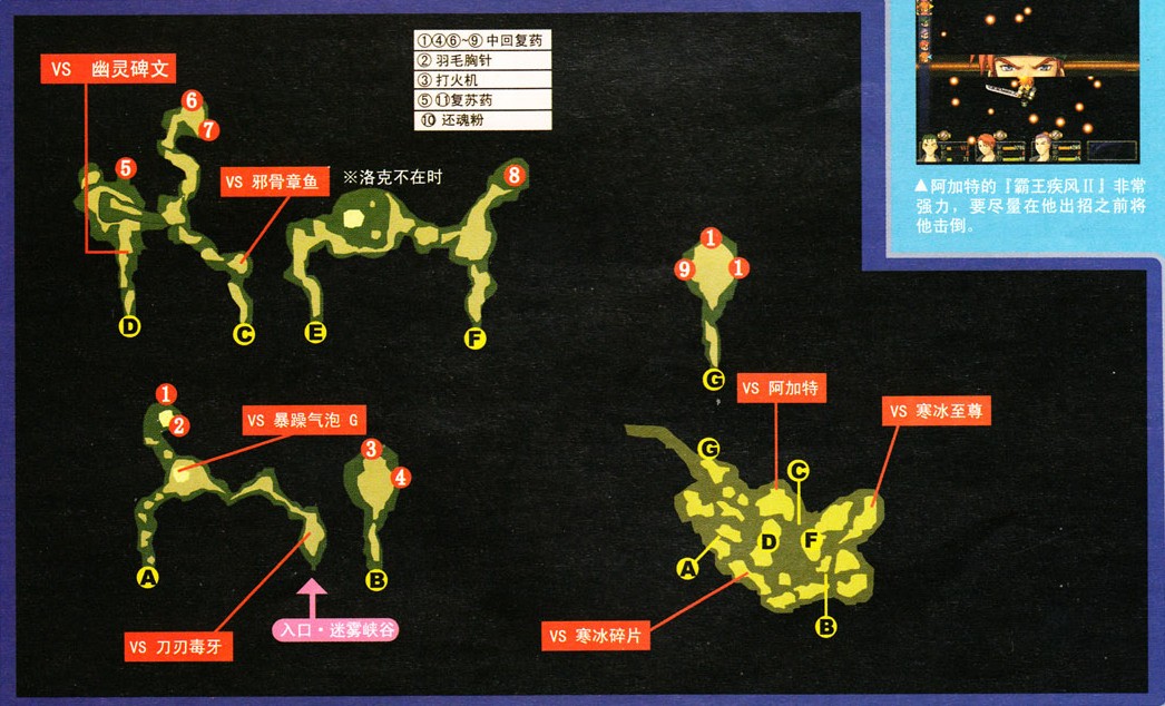 这个门里面不能使用魔法,跟维姆拉大叔对话可以吃到地狱极乐锅,效果跟SC一样,随机一个人HP变为1,CP变为零,另外两个人CP变为100。路上的怪难度不是很大,注意敌人的冰冻攻击,每个人都要靠技能帮助同伴回复。最后战斗打阿加特,给阿加特减DEF,给我方队员加STR,这场战斗难度还是不算大。(PSP据说困难以上难度开头就会有一个打火机,另外图中所有装有打火机的宝箱都会装有打火机+)