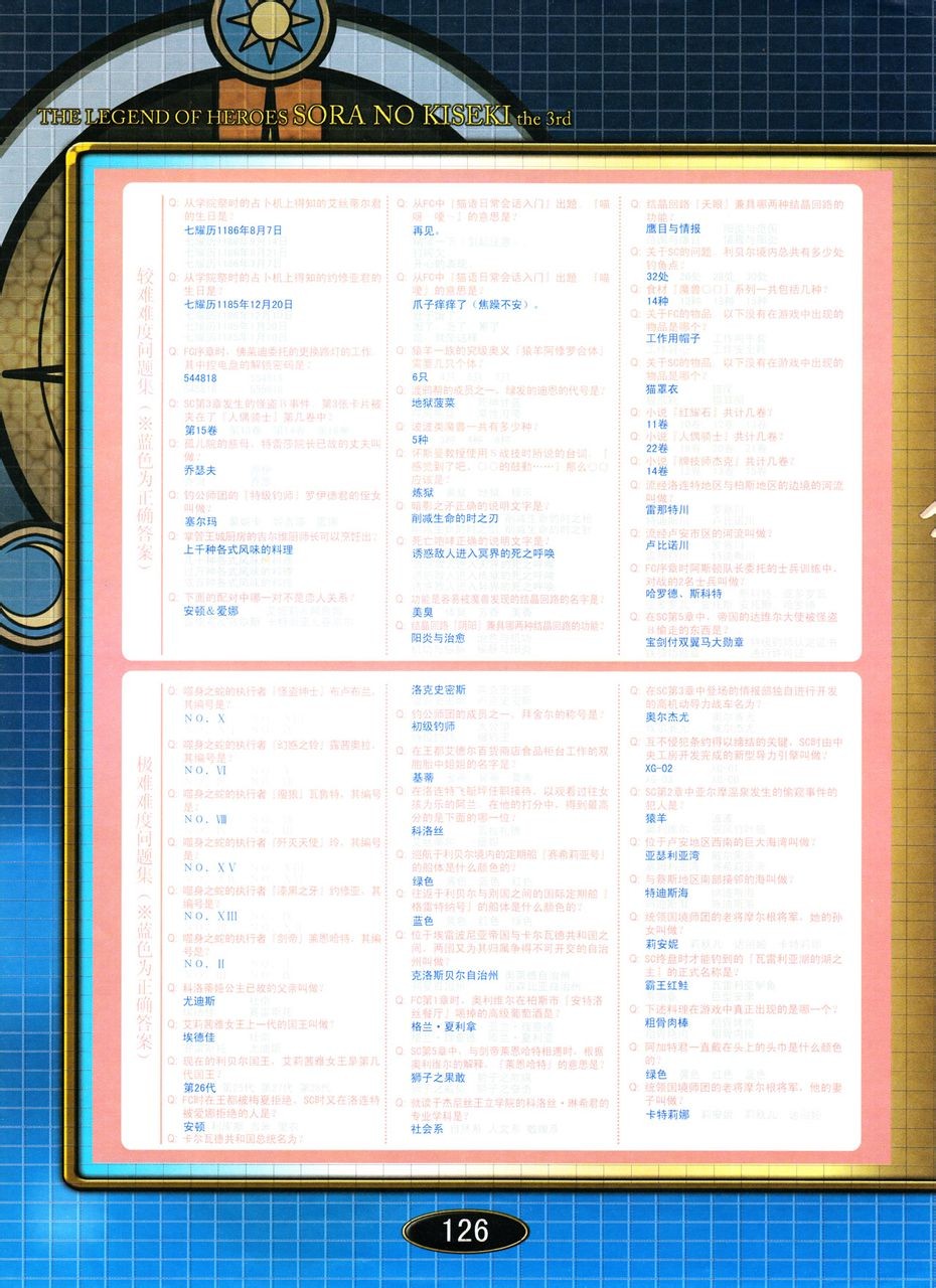 要求有全部种类的耀珠才能进入。是一个问答小游戏,都是关于轨迹系列的各种问题,就看你是否细心了。(见附图)PSP玩家注意,PSP版追加了一个Maniac难度,奖品为刻耀珠(驱动3,驱动时间减少95%,STR/DEF降低20%,ATS降低15%)