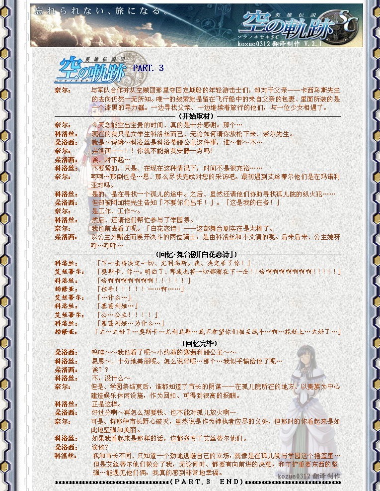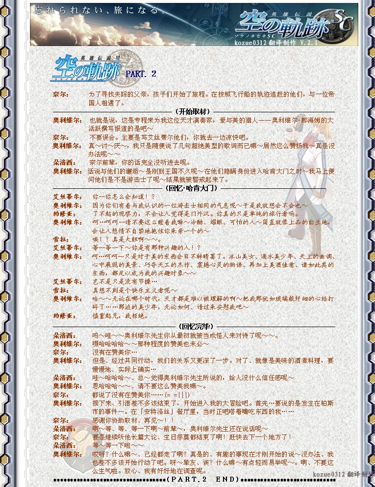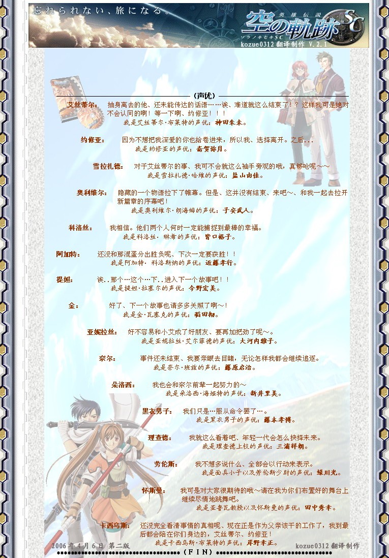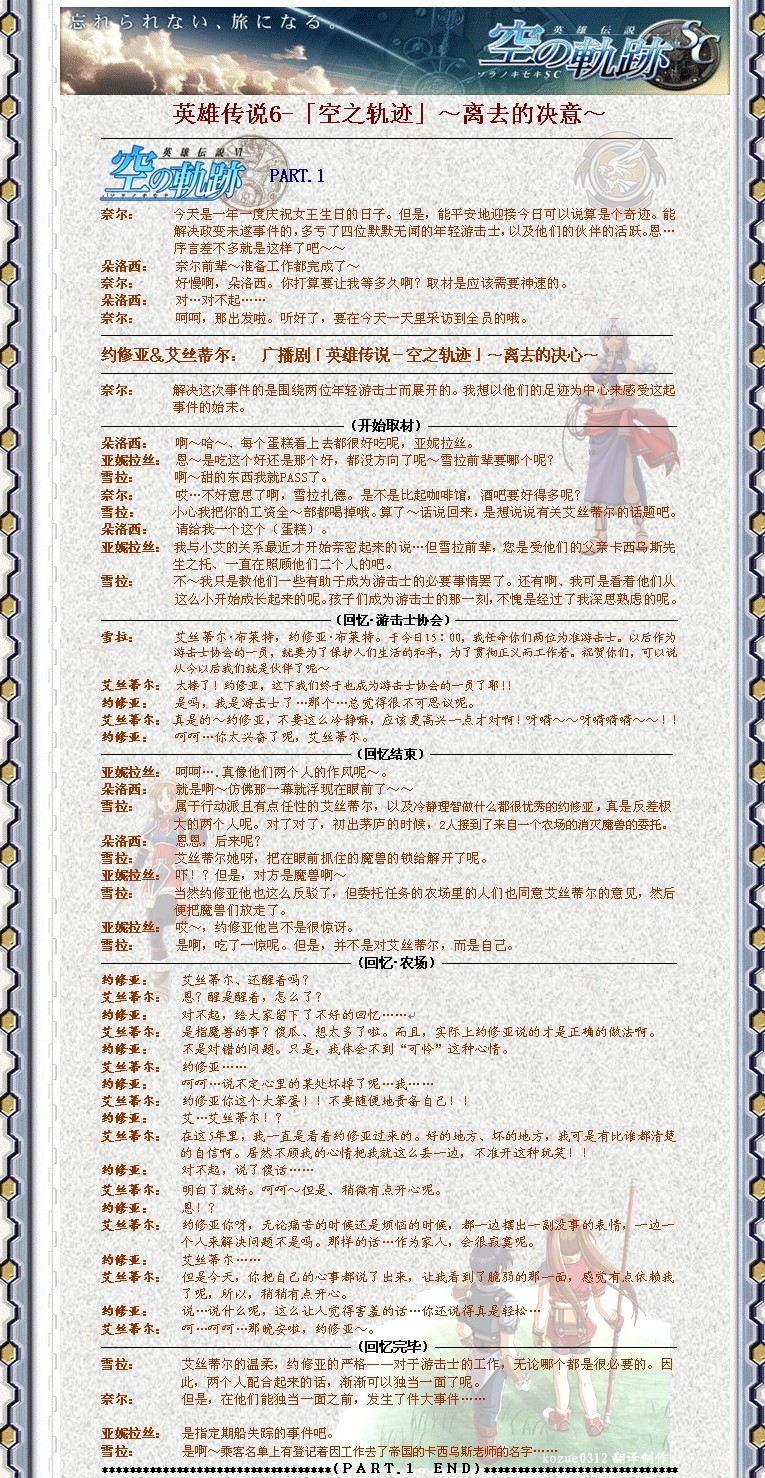 这其实是Falcom发布于FC与SC之间的一部广播剧,从另一个视角讲了FC~SC之间的这段故事,听的在网上可以找到音频,这里提供的是全剧本以及番外的中文翻译,做的很精细。这个广播剧的日文版可以在SC简体中文豪华版中获得CD。点击这里 获取广播剧的文字版。
