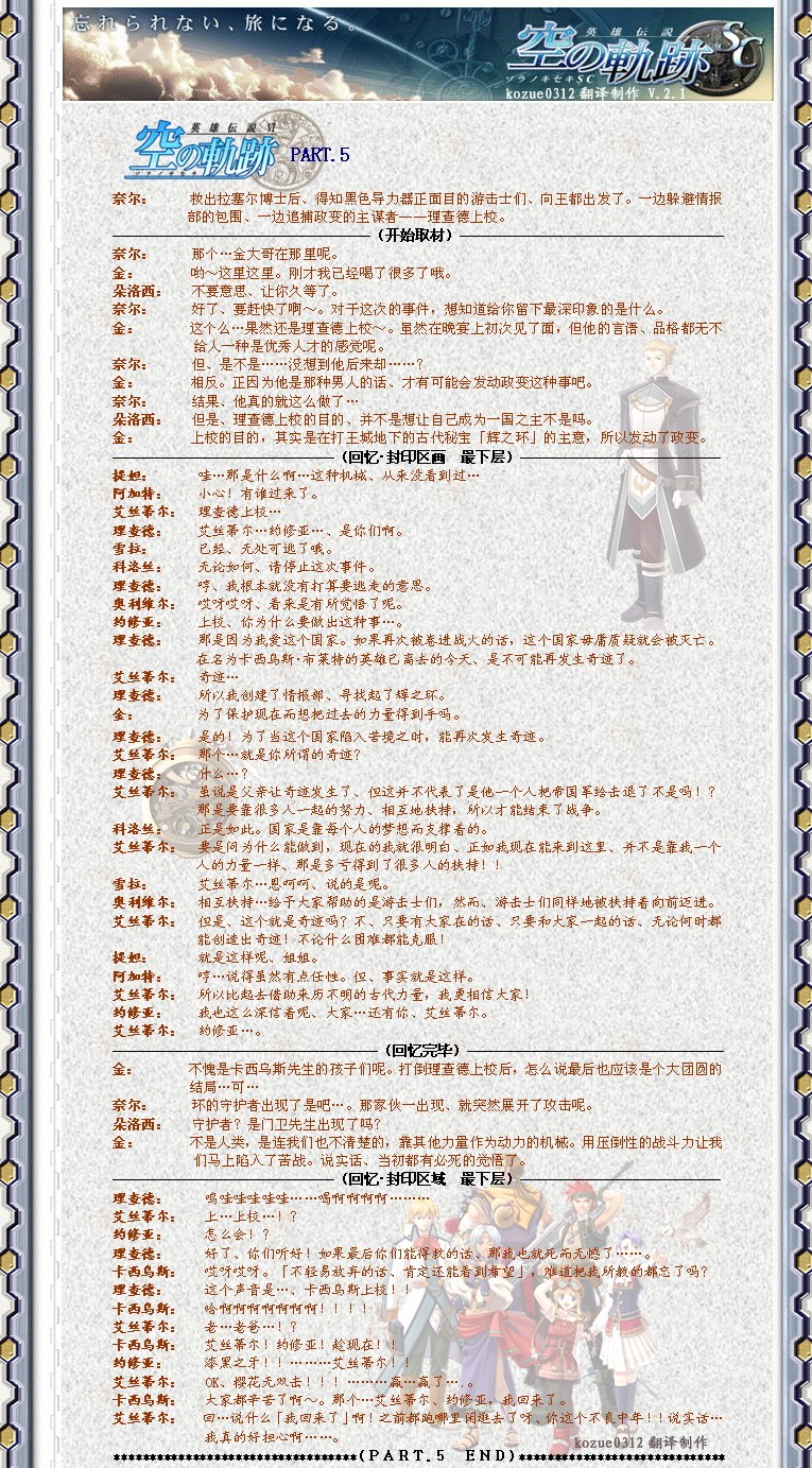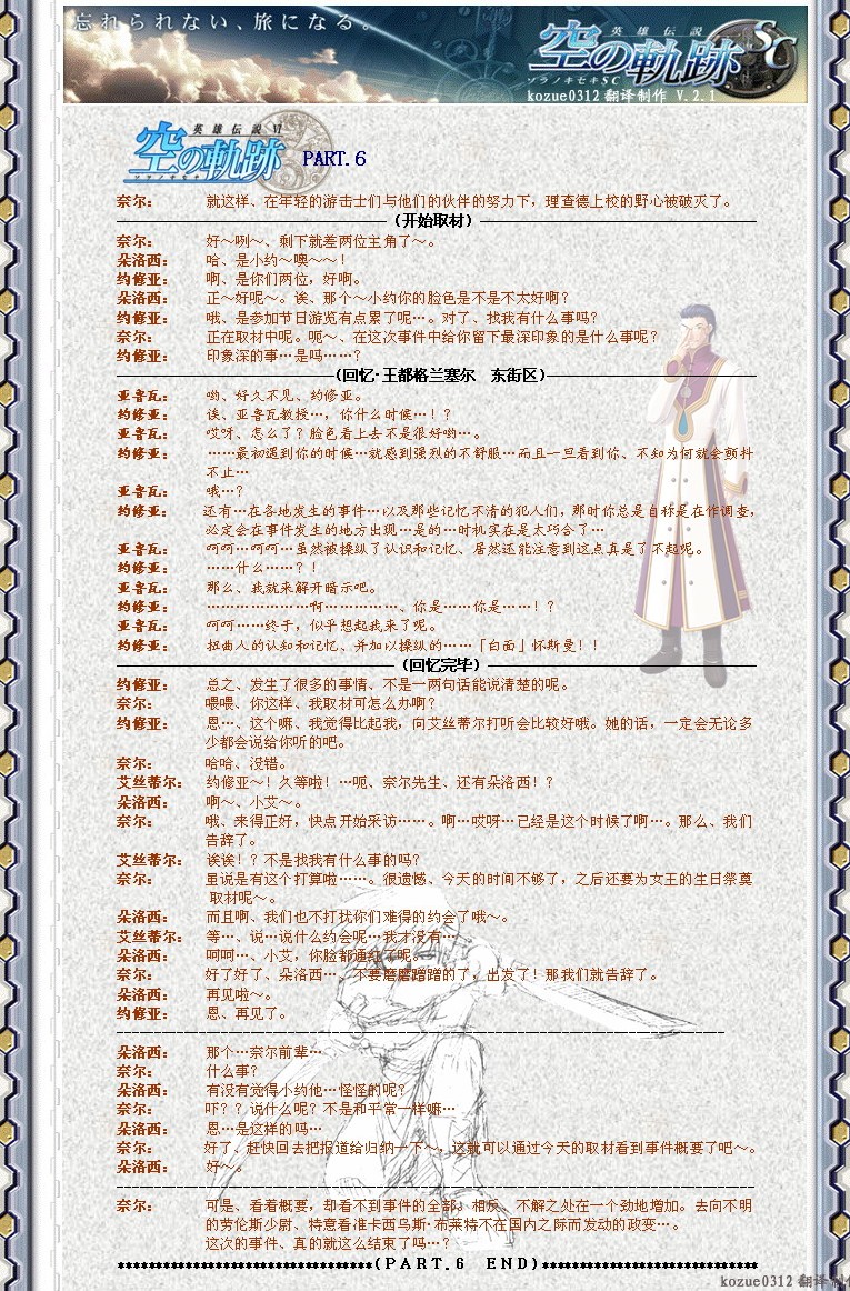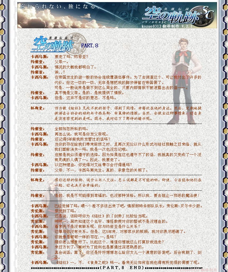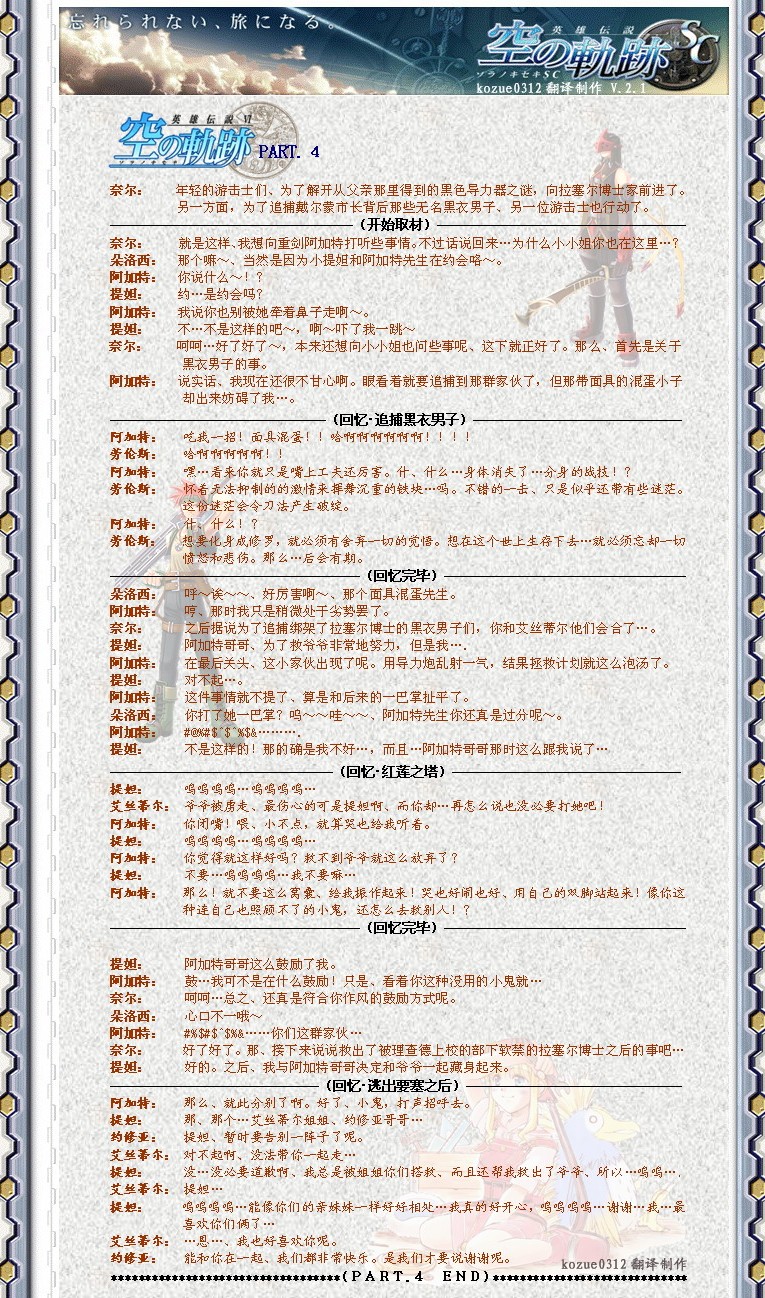 这其实是Falcom发布于FC与SC之间的一部广播剧,从另一个视角讲了FC~SC之间的这段故事,听的在网上可以找到音频,这里提供的是全剧本以及番外的中文翻译,做的很精细。这个广播剧的日文版可以在SC简体中文豪华版中获得CD。点击这里 获取广播剧的文字版。
