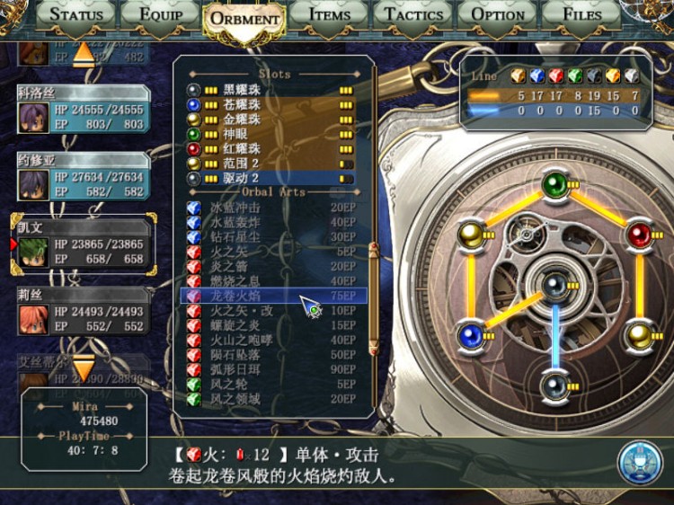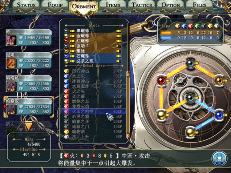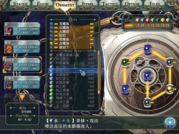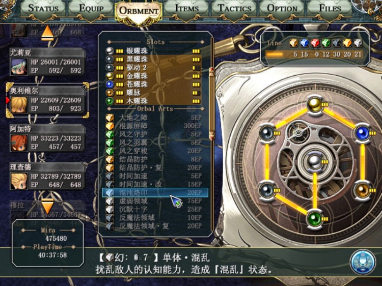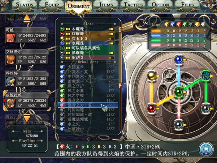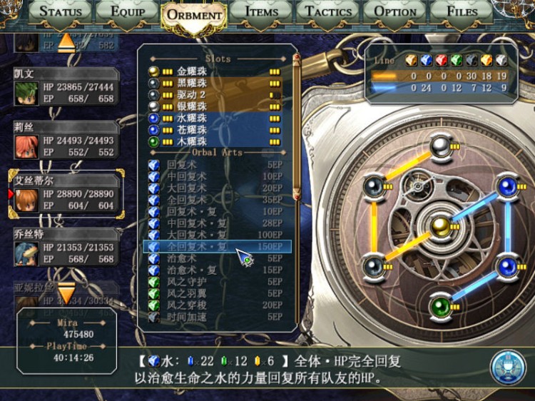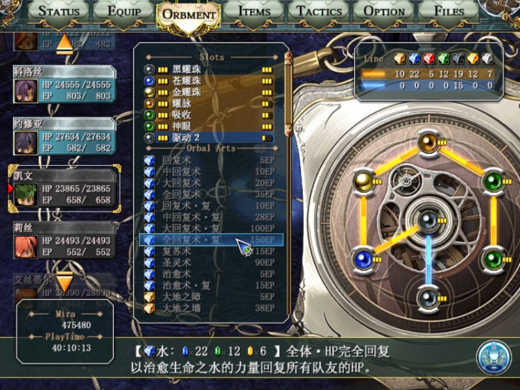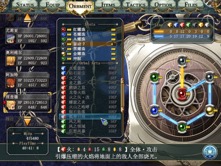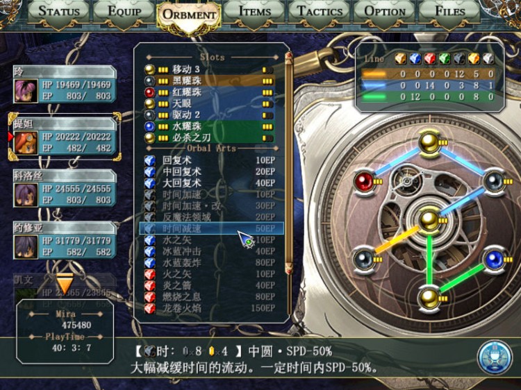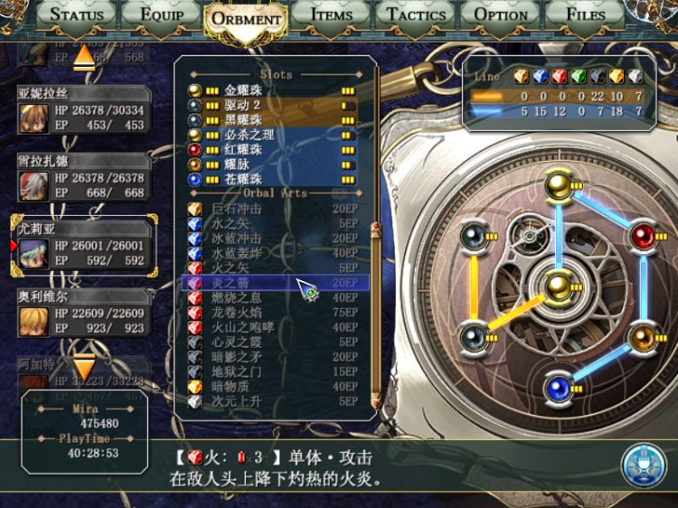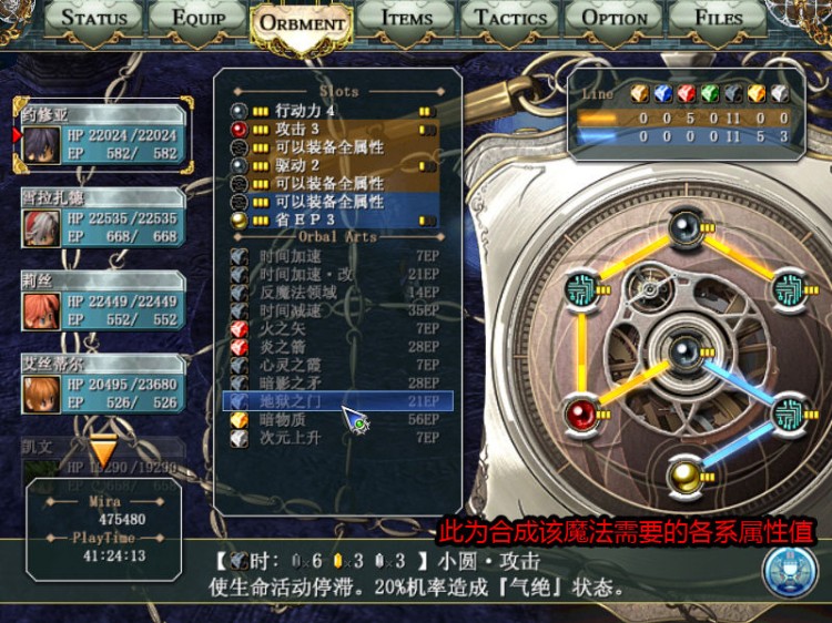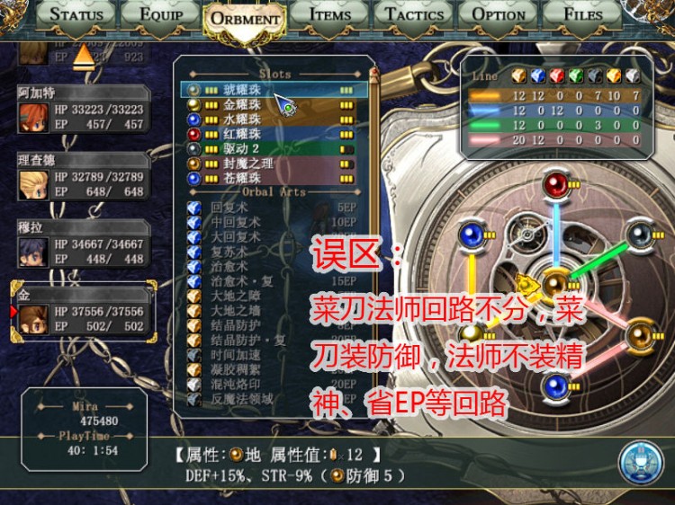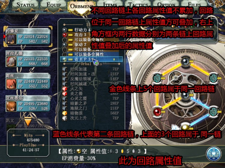 同一回路链上各回路属性值可叠加,不同回路链上不可叠加。金色链上我装了行动力4,攻击3,驱动2,金色链的各系总属性值就是时11火5,按照魔法所需要的属性值,这条链子上可以出的魔法就是时间加速改、炎之箭等魔法,蓝色链上有行动力4、省EP3,总属性值就是时11空5幻3,可以出次元上升等魔法,金色链与蓝色链上合出的几种魔法加起来就是这个导力器合出来的所有魔法