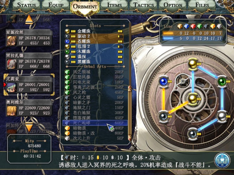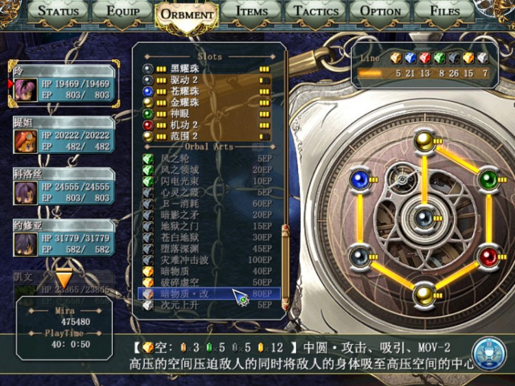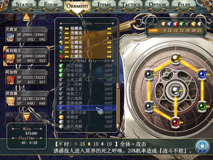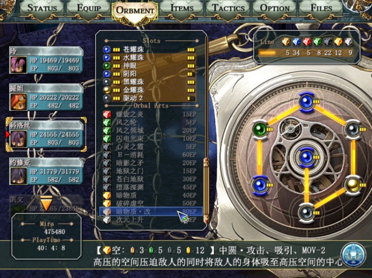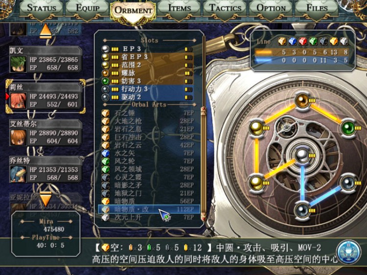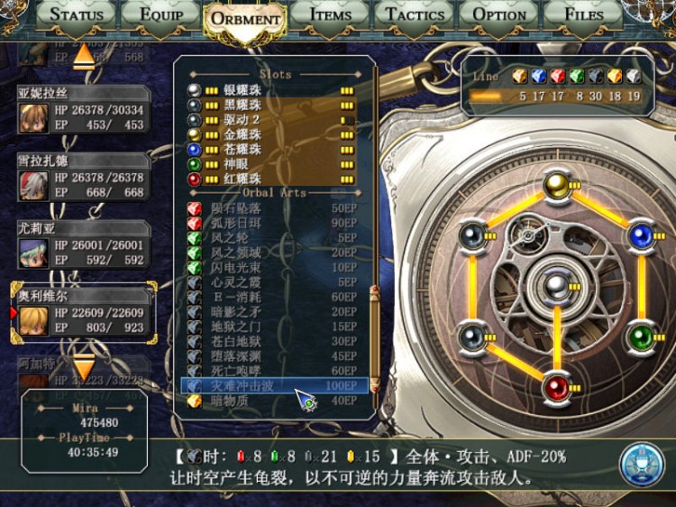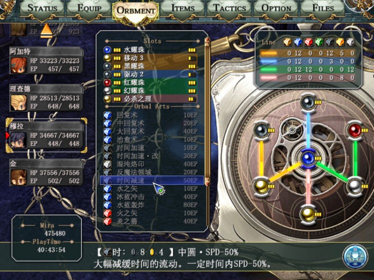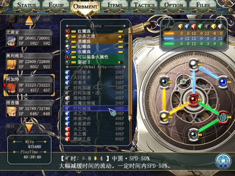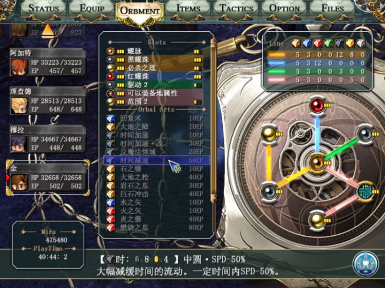 4.导力停止:个人比较喜欢的魔法,玩PSP噩梦难度时小约前期的主要工作之一就是放时减和导力停止(--+...),效果是全体ADF-30%(其实3RD不吃能力下降的BOSS不多,主要是各章最终BOSS和六章的四个守护者,就是各章最终BOSS也有吃能力下降的,比如蜘蛛),配合魔法流不错,遗憾的就是没有伤害值