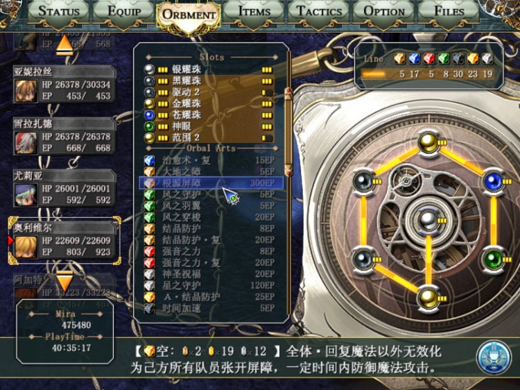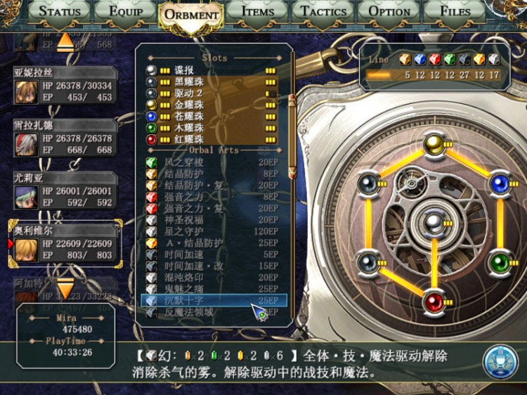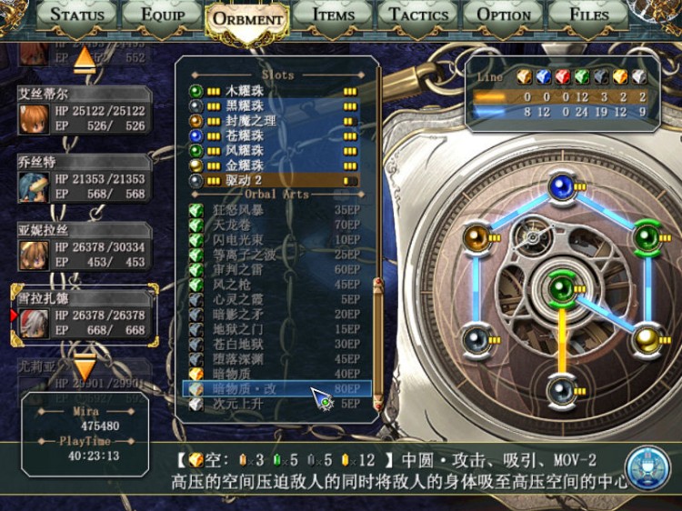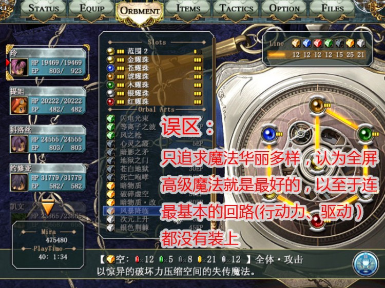 传说中的根源屏障(--=无敌鸡肋魔法,普通难度完全无用),主打时改时减、强音复、星守、导力停止、鬼魅、沉默十字、暗物质改、死亡咆哮,另外附带范围2