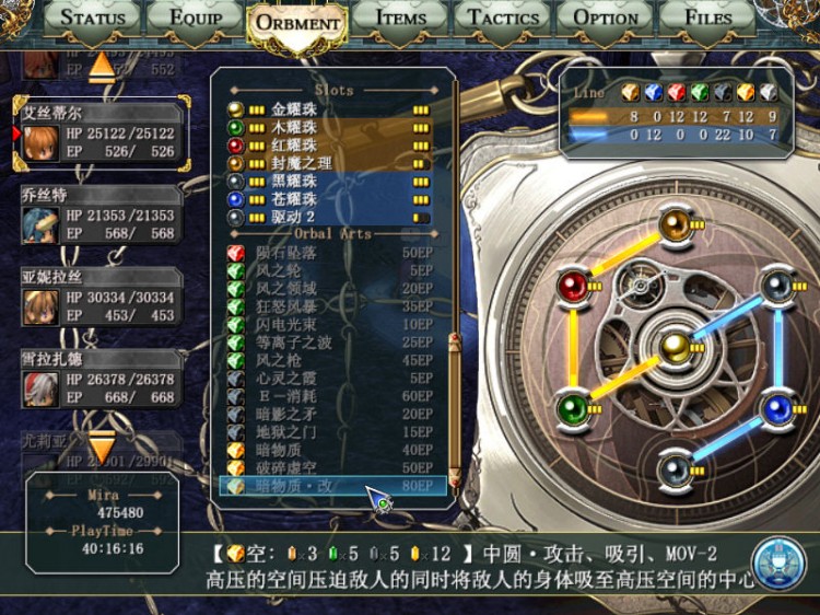 艾斯蒂尔:4-4链无回路限制,看似不怎么样的导力器其实有很多种配法,比如星之守护,全回复复,暗物质改,3RD小艾的太极轮是附加伤害仅次于樱花残月的S技,金刚击的伤害也不错,还是建议不要弄成纯辅助的