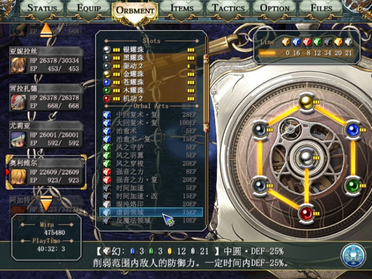 6.虚弱领域:说明上写DEF-25%,实际效果是DEF-50%,配合菜刀不错,遗憾的是幻数值要求太高,需要用到比较鸡肋的银耀珠,所以很少用